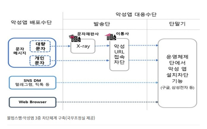 마지막으로 1,2차 단계에서 차단하지 못한 문자나 SNS 등의 피싱 문자는 스마트폰 제조사와 협력하여 개별 휴대전화의 악성앱 설치 자동방지 기능을 통해 차단하도록 할 계획이다.