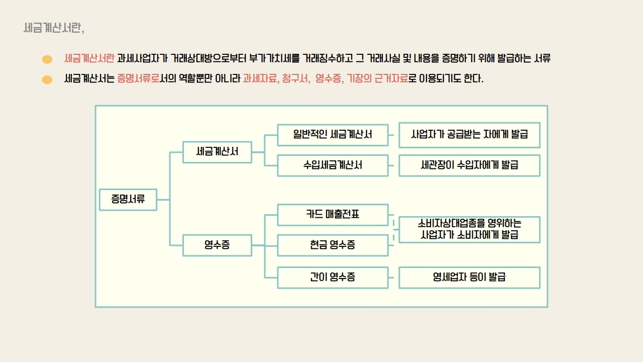 그리고 세금계산서는 증명서류로서 역할 이외에도 과세자료, 청구서, 영수증, 기장의 근거자료로 이용된다.