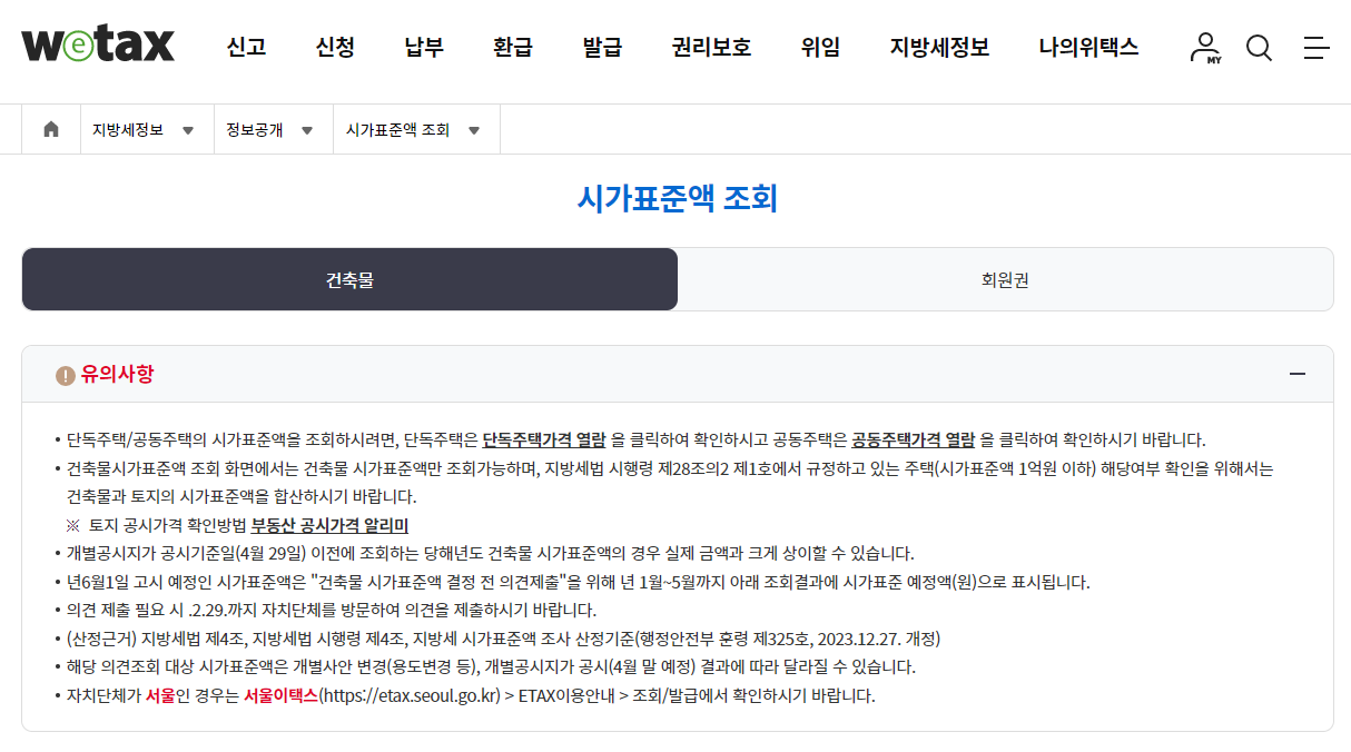 아래와 같이 시가표준액 조회 화면이 나옵니다. 시가표준액은 건축물과 회원권 조회가 가능합니다. 안내된 유의사항을 꼭 한 번 읽어 보시기 바랍니다. 회원권 탭이 아닌 건축물 탭을 선택합니다.